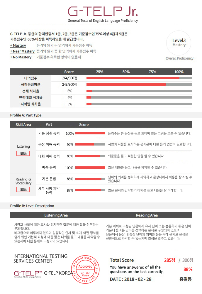 지텔프 주니어 응시생 모두에서 성적표가 제공 됩니다.